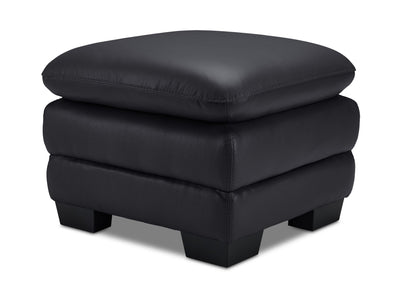 The Kendrick Ottoman is the perfect finishing touch to any living room setting. With its stunning black colour and modern look, this ottoman is designed to complement any home décor. The no-sag construction and pillow-top seat with 2.0 density foam provide superior comfort, ensuring the ottoman maintains its shape and support through everyday use. Crafted with top-grain leather, it offers a luxurious feel and refined texture that delivers a truly modern, sophisticated style. With its timeless appeal, this versatile piece fits seamlessly into any space—whether it’s your living room, den, or bedroom, the Kendrick Ottoman brings both style and comfort wherever it goes. The outer frame is padded with foam to help protect the upholstery and minimize wear and tear over time, so you can sit back, relax, and enjoy. Use it as an extra seat when guests are over or kick up your feet for everyday lounging—the Kendrick Ottoman adds just the right amount of comfort to your life.Product Dimensions: Depth: 24", Height: 18", Width: 24",