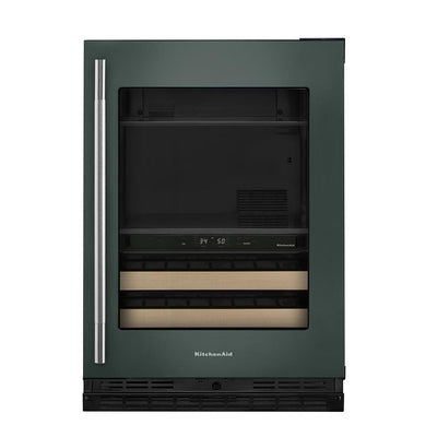 Elevate your kitchen or entertaining space with the KitchenAid 24" 5.0 Cu. Ft. Juniper Undercounter Refrigerator, where performance meets personal style. Designed to be personalized, this beverage centre is available in lush Juniper, warm Black Ore, and classic Stainless Steel, with matching handles and optional mixed metal hardware in Brass, Bronze, Black Ore, or Stainless Steel. It is a statement piece that reflects your taste while blending seamlessly into your cabinetry. With fully flush installation and hidden hinges, it sits beautifully within a standard 24-inch base cabinet, delivering a true built in look. The door opens smoothly to 115 degrees while maintaining clean, uninterrupted lines when closed. Inside, two temperature-controlled zones let you chill wines between 42 and 64 degrees in the lower zone while keeping sodas, seltzers, and charcuterie perfectly cooled above. Motion activated LED lighting gently illuminates the interior as you approach, and a temperature monitoring system adds peace of mind. Stylish, smart, and thoughtfully designed, it keeps everything ready for gathering and everyday enjoyment.Product Dimensions: Depth: 29.75", Height: 34.5", Width: 24",