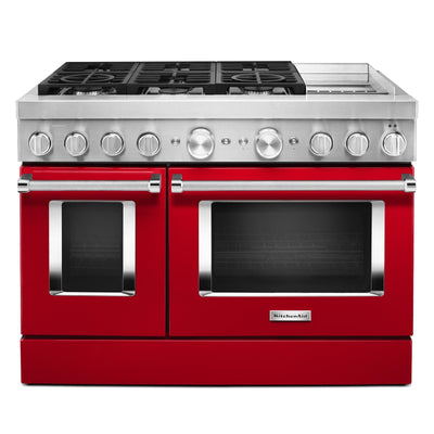 Unleash your Master Chef potential with a 48" KitchenAid commercial-style range with Even-Heat™ Chrome Electric Griddle and create a new focal point in your kitchen. Enjoy restaurant-quality results in the tranquility of your own home with six burners including two 20,000 BTU Ultra Power™ Dual-Flame and three 15,000 BTU burners. Gas burners that re-ignite automatically with Flame-Sensing™ are a satisfying perk of technology. Special order item.Product Dimensions: Depth: 30.25", Height: 36", Width: 48",