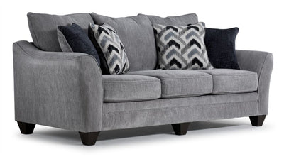 Discover your new place to snuggle up with the Lauchlin Sofa. Featuring a soothing and contemporary grey colour, it has a sophisticated and timeless look. Its neutral colour also ensures that it can seamlessly match with your existing pieces, creating a cohesive and inviting aesthetic. Crafted with gracefully curved armrests, it adds a touch of elegance, making your space look unique and refined. In addition to its stunning appearance, this sofa has some show-stopping details too! Equipped with reversible back and seat cushions, you’re able to flip and rotate to distribute wear and tear as well as maintain a fresh look. To add a delightful pop of design and texture, this piece comes with patterned accent cushions that are carefully chosen to complement and enhance the overall visual appeal. With a sturdy construction and plush comfort, sit back and enjoy the amazing benefits of the Lauchlin Sofa, designed for ultimate relaxation and style.Product Dimensions: Depth: 38", Height: 41", Width: 93",