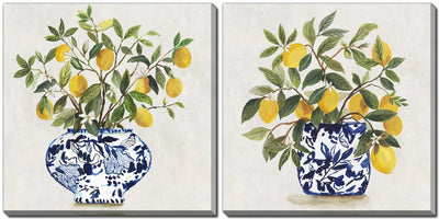 This pair blends vibrant yellow citrus with classic blue porcelain, instantly brightening a space and evoking freshness and tradition. The detailed botanical style makes it feel upscale yet cheerful. Ideal for kitchens, dining areas, or sunny breakfast nooks.Product Dimensions: Depth: 1", Height: 16", Width: 16",