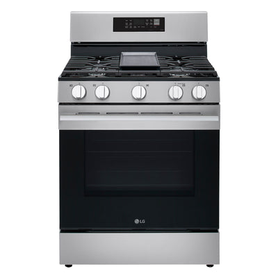 Bring restaurant-quality performance home with the LG Stainless Steel Gas Range with ProBake Convection® (6.3 cu. ft.), a perfect blend of power, precision, and modern style. Designed to deliver flawless results, LG’s ProBake Convection® system uses a powerful two-speed fan and rear heating element to circulate heat evenly—so every roast, bake, and batch of cookies comes out perfectly. Plus, with no bottom element, cleanup is faster and easier than ever. Craving crispy comfort food? The built-in Air Fry mode lets you enjoy golden fries and wings without preheating or oil, giving you all the crunch with none of the guilt. When it’s time to turn up the heat, the UltraHeat™ 20K Power Burner boils water or sears steaks in record time. And with EasyClean®, freshening up your oven takes just 10 minutes—no chemicals or high heat required. Inside, the beautiful blue porcelain-enamel interior adds durability and style, combining professional performance with everyday convenience for the perfect cooking experience.Product Dimensions: Depth: 29.5", Height: 46.5", Width: 30",