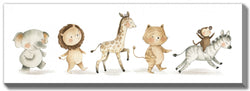 This whimsical, nursery-friendly piece brings warmth and charm to children’s spaces. Its gentle palette soothes while the playful animal characters spark joy and imagination. Perfect for creating a cozy, storybook-like atmosphere in a nursery or playroom.