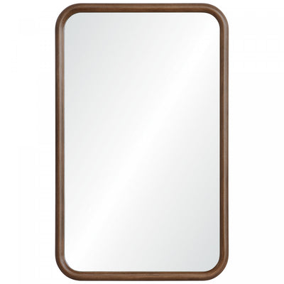 This decorative wall mirror blends simple styling with subtle industrial character, making it a natural fit for both classic and contemporary interiors. A natural wood frame with rounded, pipe-inspired detailing and softened corners frames the rectangular glass, while a warm walnut brown finish adds depth and a lived-in yet elevated feel.Product Dimensions: Depth: 1", Height: 32", Width: 20",