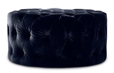 This button-tufted ottoman looks luxe in rich, blue velvet. The heavy welt trim accentuates the precise tailoring and clean lines. The Maja ottoman coordinates perfectly with the Maja sofa, loveseat and accent chair. Special order item. Please allow approximately 12-14 weeks for delivery.Product Dimensions: Diameter: 31", Height: 16",