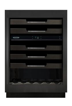 Bring a touch of refinement to your space with the Marathon 24" Dual-Zone Black Steel Wine Cooler. Designed for those who appreciate both form and function, this wine cooler keeps your reds and whites at their ideal temperatures with dual-zone flexibility, perfect for entertaining or everyday enjoyment. The sleek black steel finish blends effortlessly into modern kitchens or home bars, while the Hettich zero clearance hinge allows for seamless installation, even in tighter cabinetry. The soft-close door adds a quiet, premium touch you will notice every time you reach for a bottle. Inside, advanced variable airflow technology works alongside a copper evaporator cooling system to maintain consistent temperatures across both zones. This helps preserve flavour and character without unwanted fluctuations. Eco-friendly HFO insulation improves energy efficiency while supporting quiet, reliable operation. Proudly made in Canada, this wine cooler delivers trusted craftsmanship built for local homes and everyday use. Stylish, dependable, and ready to entertain, it keeps every pour perfectly chilled.