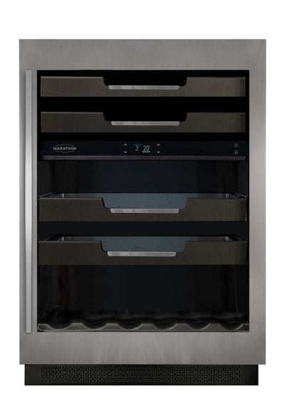 Keep your favourites perfectly chilled and ready to serve with the Marathon 24" Dual-Zone Stainless Steel Wine & Beverage Cooler. Designed for both wine and everyday drinks, this dual-zone cooler gives you the flexibility to store reds, whites, and beverages at their ideal temperatures, all in one sleek, built-in design. The stainless-steel finish adds a clean, modern look, while the Hettich zero clearance hinge allows for easy installation in tighter spaces. The soft-close door brings a smooth, quiet feel that elevates your space with every use. Inside, advanced variable airflow technology works with a copper evaporator cooling system to maintain consistent temperatures across both zones. This means your wine and beverages stay properly chilled, helping preserve flavour and freshness without temperature swings. Eco-friendly HFO insulation supports efficient, quiet operation while maintaining stable internal conditions. Proudly made in Canada, this cooler is built for local homes with quality materials and dependable performance. Stylish, practical, and made for entertaining, this wine and beverage cooler keeps everything you love perfectly chilled and within reach.Product Dimensions: Depth: 24", Height: 34.25", Width: 23.5",