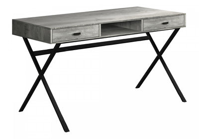 This widely-applicable industrial style desk finished in a grey reclaimed wood look is equally functional as a computer desk, writing table or study centre. Sized for small homes, apartments or condos, space saving is a breeze thanks to this piece that is supported by a sturdy black metal x-design base to ensure stability and a comfortable work environment. This office desk is equipped with two convenient and easy-open storage drawers for all you need to store away while not in use. With lots of space to push the chair in, the desk is compact and the thick panel top has the perfect amount of surface space for a laptop/tablet, lamp, notebook and some important supplies to get the job done.Product Dimensions: Depth: 47.25", Height: 29.25", Length: 61", Width: 23.75",