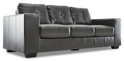 The neutral colour and contemporary finishes of this dark grey sofa elevate its smart, sophisticated appearance. The slick leather-look fabric is accentuated by tufted cushions throughout. Quilt stitching on the back pillows, which extend beyond the solid frame, raises the comfort level of this distinguished piece.