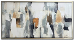 This abstract piece features a collection of figures in soft, earthy tones, accented with splashes of bolder colour. The neutral palette and the fluid, indistinct forms make it versatile and soothing, ideal for creating a calm and contemplative space.