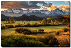 This landscape blends lush valleys with rugged peaks and early sunlight. A wonderful way to bring the outdoors in, especially for rustic, lodge-style, or transitional interiors.