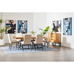 Create the ultimate entertainment area with the Newport 7-Piece Extendable Dining Set in Oak and Black. Showcasing a beautiful natural oak veneer tabletop and matte black metal legs, this bold, contemporary design is built to enhance your dining experience. With the 20-inch extension leaf, the table easily expands to become the ultimate party-hosting dining table. Perfect for those who love entertaining guests, this table offers plenty of room for everyone to gather and enjoy a feast without feeling crowded. The 20-inch table leaf conveniently stores beneath the tabletop, offering a clutter-free design that combines style with everyday practicality. The Newport dining chair is upholstered in a soft polyester chenille fabric, that offers a refined look and pairs perfectly with the matte black metal legs for a modern, durable design. Sturdy metal stretchers add extra support and strength, making them ideal for everyday use in busy households. Whether you're hosting a celebration or enjoying a weeknight dinner, the Newport 7-Piece Extendable Dining Set keeps your guests comfortable and your dining space effortlessly stylish.