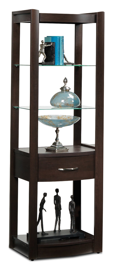 Open Air. Style is on display with the Newton universal pier, which mixes an airy design with touches that retain a charming and traditional feel. The java finish, chrome hardware and bowed drawer fronts call to mind rich, sophisticated spaces while the open, glass shelving creates a piece that blends easily with your décor and accessories rather than overtaking them. Made in Canada. Some customer assembly required.Product Dimensions: Depth: 18", Height: 70", Width: 103",