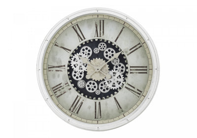 - Bring a stylish and trendy accent piece to your home decor with this large, oversized 30" round wall clock with a striking gear mechanism design in a chic white finish.