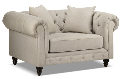 Field of Dreams. When you take the classic chesterfield design, add dreamy, soothing linen-blend upholstery in a cool neutral, you'll have a sense of how the Nubia chair and a half can transform your living room. Right away, you and your guests will fall for the diamond-pattern, button-tufted barrel back and pleated roll arms. Even the base of the chair is dotted with a row of stitched button accents. For easy upkeep and longevity, rotate the loose seat cushion to promote even wear. Elegantly turned, dark-hued feet provide a traditionally stylish endnote. Made in Canada.Product Dimensions: Depth: 41", Height: 33", Width: 57",