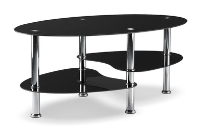 Future Perfect. Black glass, polished chrome and geometric elements combine to give the Oriana coffee table a distinctly futuristic feel. The metal table legs offer sturdy support for the sleek tabletops and lower shelves, and their high-shine isn't the only attention-grabber: split-level lower shelves draw the eye and provide the option for a more thoughtful display. Customer assembly is required.Product Dimensions: Height: 16", Length: 40", Width: 24",