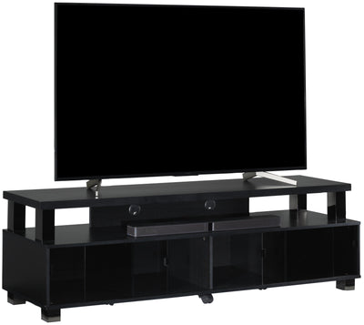 Keep Pace. Be sure to keep up with the latest in living room and home entertainment furniture with the sleek, functional Pacey TV stand. Boasting a deep ravenwood black finish, this piece's dual-level design supplies plenty of space for your media components, especially audio equipment. Wire management openings and sliding glass doors offer convenience in organizing your electronics and peripherals. Customer assembly is required.Product Dimensions: Depth: 20", Height: 22.5", Width: 75.5",