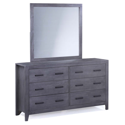 Elevate your bedroom with this unique eye-catching dresser. Its stunning grey finish features wood grain drawer fronts for a hint of rustic aesthetic combined with black drawer handles and tilted feet for that overall remarkable look. This dresser features six smooth-gliding drawers to store all your bedroom essentials. Its low-profile appeal flaunts a high-style design that makes a statement in any bedroom. Made of 100% solid Brazilian Pine, this dresser has unique natural characteristics that contribute to its overall gorgeous appeal. Featuring the wood’s natural look and treated to a unique water-based eco-friendly finish that emphasizes the beauty of the wood grain. Whether your décor is rustic, transitional or contemporary, this collection is a stunning choice. Match it with the rest of the Palm Harbour collection, or your own eclectic furnishings. Please note the mirror is not included and sold separately.Product Dimensions: Depth: 18", Height: 36", Width: 62",