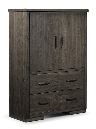 Refined Rustic. The Pine Ridge armoire offers a touch of the outdoors without forgoing that chic, contemporary look you want for your personal escape. Solid pine construction in a versatile slate hue showcases natural wood grains and knots to set this nature-inspired scene, while matte-finished hardware and classic, clean lines show off this furniture's contemporary roots. Update your bedroom with the Pine Ridge armoire and watch timeless style take centre stage. Made in Canada. Customer assembly required.Product Dimensions: Depth: 20", Height: 60", Width: 43",