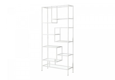 Show off your decorative items in style: plants, photo frames, books or even electronic devices thanks to this bold white metal etagere bookcase simply made to impress. With nine tempered glass asymmetrical shelves, the backless bookshelf's design blends perfectly in your living room, office, bedroom or entrance area of any small home, condo or apartment where space is limited. It's the perfect accent piece to maximize space!Product Dimensions: Depth: 12", Height: 72", Width: 32",