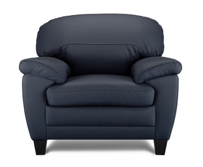 The Raphael Chair is the epitome of luxury and style. This piece showcases a rich navy colour, that will always feel welcoming. Crafted with 100% top grain leather all around, this chair gives your home the feeling of sophistication. Indulge in comfort and modern design features with wide tapered armrests and subtle white accent stitching which brings a touch of elegance to this piece and allows this chair to blend into any contemporary home decor. With the attached seat and back cushion for support you will be able to enjoy and feel the comfort. Proudly made in Canada this chair reflects quality craftsmanship and meticulous attention to detail. Experience all the Raphael Chair has to offer and transform your home into a true indulgence of comfort and elegance.Product Dimensions: Depth: 37", Height: 35", Width: 42",