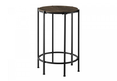 The perfect combination of style and functionality, this sleek and modern accent table brings fashionable style with a chic, dark oak laminate finish on the round table top and black metal legs. This trendy 24 inch high side table is not only a practical addition, but also has a space saving design with room for a lamp or decorative accessories, making a stylish statement in small spaces. Durably designed with an easy to clean top and sturdy metal legs, this accent table is built to last and comes with a 5 year limited warranty against manufacturer defects for your peace of mind. The easy to assemble design makes set-up a breeze and whether you use it as an end table, side table, or nightstand in your living room or bedroom, this accent table will add the perfect contemporary touch to your decor.Product Dimensions: Depth: 16", Height: 23.5", Width: 16",