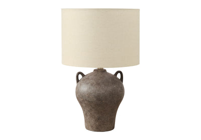 - This 22"h table lamp features a striking, mottled brown ceramic base shaped like an ancient jug, paired with a contemporary beige fabric shade, for a stylish addition to any living room, bedroom, or home office decor.