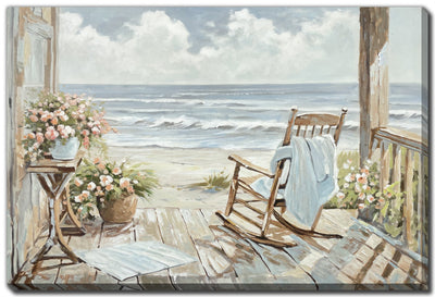 A cozy wooden porch overlooking the ocean, complete with a rocking chair and flowering plants, brings a homey, nostalgic feeling. Ideal for country, cottage, or beach-style decor, it invites thoughts of relaxation and simpler times.Product Dimensions: Depth: 1.5", Height: 30", Width: 45",