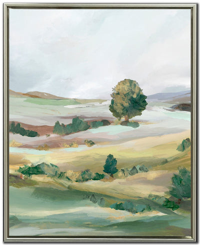 Rolling green pasture in earth tones with tree in the background. Captivating piece of art that brings life and creativity to your home. Highlighted with clear and crisp design lines, the art signifies quality and style. Bring home this piece to add a little extra dash of colour and warmth to any spaceProduct Dimensions: Depth: 1.5", Height: 31", Width: 25",
