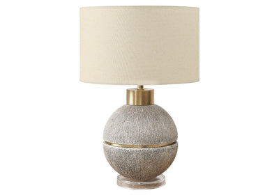 Make your home into a haven of style with our 26" table lamp, a striking fusion of contemporary design and modern flair. Crafted with a unique, textured finish base in a stunning light brown resin and accented in gold around the globe shaped body, this lamp is not just a source of lighting but an eye-catching decorative accent that will brighten any room. This lamp sits atop a clear acrylic base and finished off with a chic beige fabric shade, making it a perfect fit for your living room, bedroom, or office. Whether setting the mood for a cozy evening or need focused light for your work, its convenient 3-way switch allows you to adjust the ambiance with the use of a 100W bulb (3-way bulb not included) to suit your lighting needs. Place this stylish accent lamp on an end or side table or use it as a bedside lamp on your nightstand and let its glow create an inviting atmosphere. Plus, enjoy peace of mind with our 2 year limited warranty against manufacturer defects, ensuring this lamp will light your way for years to come. Illuminate your space and make a statement with this fashionable and trendy brown resin table lamp with a beige shade_x0014_ where function meets fabulousness in perfect harmony.Product Dimensions: Depth: 16", Height: 25.5", Length: 13", Width: 16",