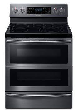 This Samsung electric radiant convection range is finished in sleek black stainless steel and can split into two ovens, with convection cooking in each, using the Smart Divider. The total capacity of 5.9 cu. ft. and two ovens, which allows the top section and the full oven to be accessed separately with the middle-hinged door, provides ample room for multiple, large dishes. Additionally, a warming drawer keeps food well-heated while you wait for other dishes to finish cooking.