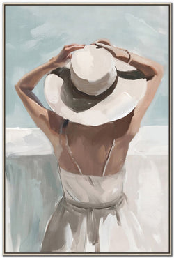 This woman in a sun hat looking out exudes a sense of relaxation and escape, perfect for coastal or serene-themed interiors. It brings a touch of elegance and calmness, ideal for bedrooms or reading nooks.