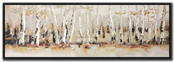 Birch trees are symbolic of renewal and quiet strength. This forest scene adds depth and earthy elegance to a room. The gold and ivory hues create warmth, ideal for entryways, dens, or nature-themed living rooms.