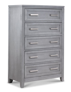 Discover the beauty of practical elegance with the Silverstone 5 Drawer Chest. Designed with functionality in mind, this 5-drawer chest provides ample space for your belongings while serving as a sturdy, reliable addition to your bedroom. Showcasing lasting durability and timeless style, it’s a piece built to elevate your everyday routine. Crafted from acacia solids, manufactured wood, and oak veneer, the Silverstone chest blends the natural beauty of real wood with a soft mist grey finish. The wood grain is brought to life through a multi-step finishing process, including wire brushing and white glazing, which gives it a light, airy tone with depth and character. This chest highlights refined craftsmanship with its picture frame mouldings, tapered legs, and sleek drawer pulls. The five drawers are built with French dovetail joinery in the front and English dovetail joinery in the back, offering enhanced strength and durability. Full-extension glides ensure smooth operation and easy access to all your essentials. Enjoy the perfect blend of storage, sophistication, and craftsmanship with the Silverstone 5 Drawer Chest —a stylish solution for a well-organized bedroom.