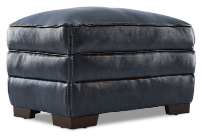 Upscale Rugged. The Stampede ottoman offers a rugged yet luxurious look in any living room with its smooth top-grain leather. The natural grains and the glossy shine of the neutral grey, charcoal-coloured semi-aniline leather showcase a stunning contrast that adds to the rich appearance. A stacked base gives this furniture added visual appeal while offering enhanced comfort and support, and the foam-filled top cushion invites you to put your feet up after a long day.Special order item. Please allow approximately 12-14 weeks for delivery.Product Dimensions: Depth: 20", Height: 19", Width: 30",