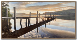 This serene dock scene captures the beauty of a lake reflecting the sunset. The soft, warm colours evoke peace and relaxation, ideal for creating a calm focal point in living spaces or bedrooms.
