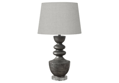 - This 28"h table lamp features a stylish grey resin base supported on a clear acrylic base and topped with a soft grey fabric shade, serving as a chic accent lighting piece for transitional decors, making it perfect for fashionable living rooms, bedrooms, or home offices.