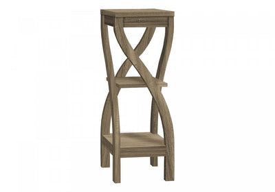 This contemporary accent table with curved legs offers a playful twist on displaying decorative items. The sturdy legs curve for a dynamic, twisting effect that will attract as much attention as the objects displayed on the table. Featuring a square tabletop and 2 shelves, its 3-tier design maximizes the vertical display space available in a living room, an entryway, or any room in need of a small table with storage. This side table in a dark taupe wood-look finish has a versatile style that can serve a variety of purposes, including as an indoor plant stand.Product Dimensions: Depth: 11.5", Height: 32", Width: 11.5",