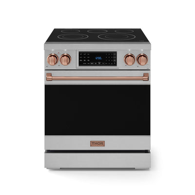 Bring culinary inspiration home with the Thor Kitchen Stainless Steel Freestanding Professional Electric Range from the Gordon Ramsay Series. The Panoramic Viewing Window offers a crystal-clear view of your oven’s interior, letting you monitor dishes without disrupting the cooking process or losing precious heat. The Tilt Panel Touch Control adds an ergonomic touch, effortlessly angling for comfortable viewing and seamless operation. With the White Projector Light illuminating the control panel, every setting is easily visible, even in dim kitchens, blending style with practicality. Beneath the sleek ceramic glass surface, radiant burners deliver consistent, even heat for precise cooking, from delicate sauces to hearty meals. Adjustable 3-inch feet with square decorative covers ensure a polished, tailored look that integrates beautifully into your kitchen layout. Whether it’s weeknight dinners or elaborate feasts, this electric range combines professional-grade performance with thoughtful design. Inspired by Gordon Ramsay’s mastery, it transforms your kitchen into a stage for creating culinary masterpieces, ensuring every meal is as memorable as the last.Product Dimensions: Depth: 29.75", Height: 36", Width: 30",