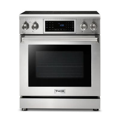 Transform your kitchen with the Thor Stainless Steel Freestanding Tilt-Panel Electric Range, designed for culinary enthusiasts who crave versatility and style. This innovative range features a true convection fan that blows heat from an 800W heating element, ensuring even heating and optimum cooking and baking results. The unique tilt panel allows you to touch and adjust the control panel to your preferred angle, providing a customizable cooking experience with easy control of cooktop and oven settings. Create healthier, mouthwatering meals with the air fry feature, perfect for guilt-free indulgence. The hidden bake element, positioned below the oven floor, ensures a smooth oven surface, making spills easy to clean without maneuvering around heating elements. Sleek and modern, this range offers everything you need for perfect results every time. Elevate your cooking with the Thor Stainless Steel Freestanding Tilt-Panel Electric Range, combining cutting-edge features with exceptional performance. Experience the ultimate blend of style, convenience, and functionality, with this electric range.Product Dimensions: Depth: 26.5", Height: 36", Width: 30",