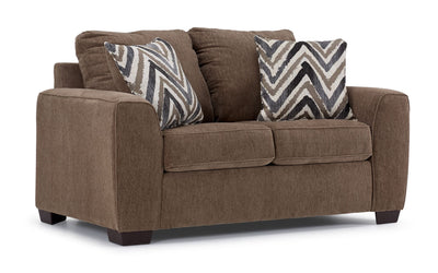 Experience the soft, cozy feel of the Tuscan Loveseat. The neutral colour allows this loveseat to pair with any home décor and modern style living room. Upholstered with a soft, corduroy fabric, this loveseat adds a sophisticated look to your home while inviting relaxation. The fully padded curved armrests add a layer of elegance and provide optimal comfort, so your arms will always be comfortable. The back cushions are attached, the seat cushions can be rotated to keep the comfort flowing but the seat cushions cannot be flipped. The 2 accent pillows will add to your comfort and draw instant attention with the design. With the 1.8 density CertiPur seat foam cushions, this loveseat brings comfort, longevity, and stability with the hardwood frame, so you can enjoy sitting on this loveseat for years to come. Enjoy unwinding from work, or just relaxing with friends and family on the Tuscan Loveseat.Product Dimensions: Depth: 38", Height: 39", Width: 66",