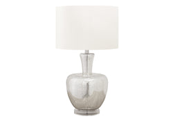 - Glamourize your decor with this contemporary 26"h table lamp, featuring a stylish silver glass body on a clear acrylic base and an elegant ivory fabric shade, perfect for adding a touch of sophistication to any room.