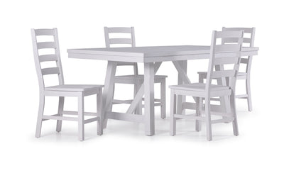 - Side chairs feature a classic ladder-back design with solid wood framing and wooden seats on block legs