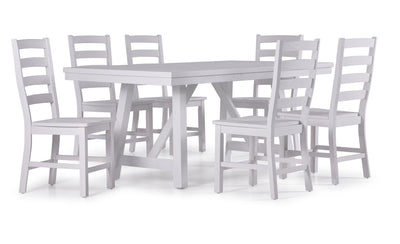 - Side chairs feature a classic ladder-back design with solid wood framing and wooden seats on block legs