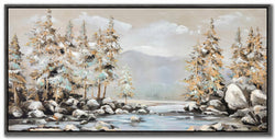 This serene winter scene of a snow-dusted forest and river captures the quiet beauty of nature. Ideal for cozy, rustic, or lodge-style decor, it brings a cool, calming feel with a touch of seasonal charm.