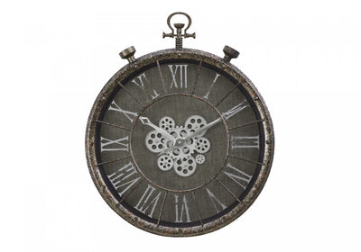 - Sophisticated, vintage, pocket-watch style 24" round wall clock with a moving gear mechanism in rustic grey finish suitable for transitional style decors.