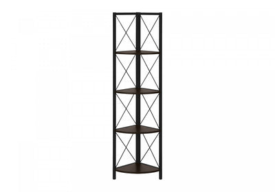 Perfect for photo frames, plants, other decorative items and even kitchen accessories, this transitional-style corner bookcase will upgrade your decor. Including 4 solid dark brown espresso display shelves, this corner display unit features a three-leg black metal frame and a X-design to add modern flare wherever you choose to place it. This corner etagere bookcase is sure to impress. Assembly is required.Product Dimensions: Depth: 12.5", Height: 59.25", Width: 17.5",
