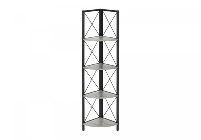 Perfect for photo frames, plants, other decorative items and even kitchen accessories, this transitional-style corner bookcase will upgrade your decor. Including 4 grey wood-look display shelves, this corner display unit features a three-leg black metal frame and a X-design to add modern flare wherever you choose to place it. This corner etagere bookcase is sure to impress. Assembly is required.Product Dimensions: Depth: 12.5", Height: 59.25", Width: 17.5",