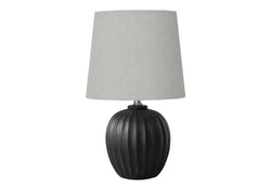 - This stylish 19" table lamp features a chic black resin base and complementary grey fabric shade, perfect for creating a warm, inviting ambiance in transitional style living room, bedroom, or office space.