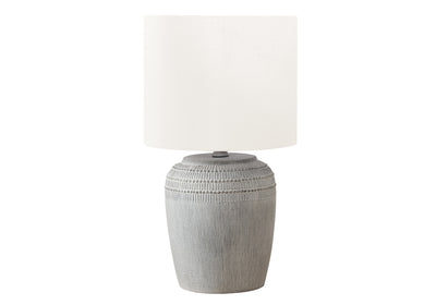 Refresh your living room, bedroom, or home office with this stylish 17" table lamp in grey ceramic. The elegant, jar shaped grey base with a textured finish along the top is paired with an ivory fabric shade for a contemporary upgrade. This lighting accent is ready to brighten any corner of your home, whether placed on an end or side table, a nightstand, or your office desk, providing just the right amount of light to create the right ambiance. The on/off turn knob switch operating up to a 60W standard bulb (not included) makes it easy to illuminate your space with a simple twist. This decorative lamp includes up to a 2 year limited warranty against manufacturer defects ensuring that it remains a lasting fixture in your home. Embrace the classic styling of this ceramic table lamp with a modern drum shade for a fashionable and on-trend accent piece that compliments all decors.Product Dimensions: Depth: 9.5", Height: 17", Length: 4", Width: 9.5",